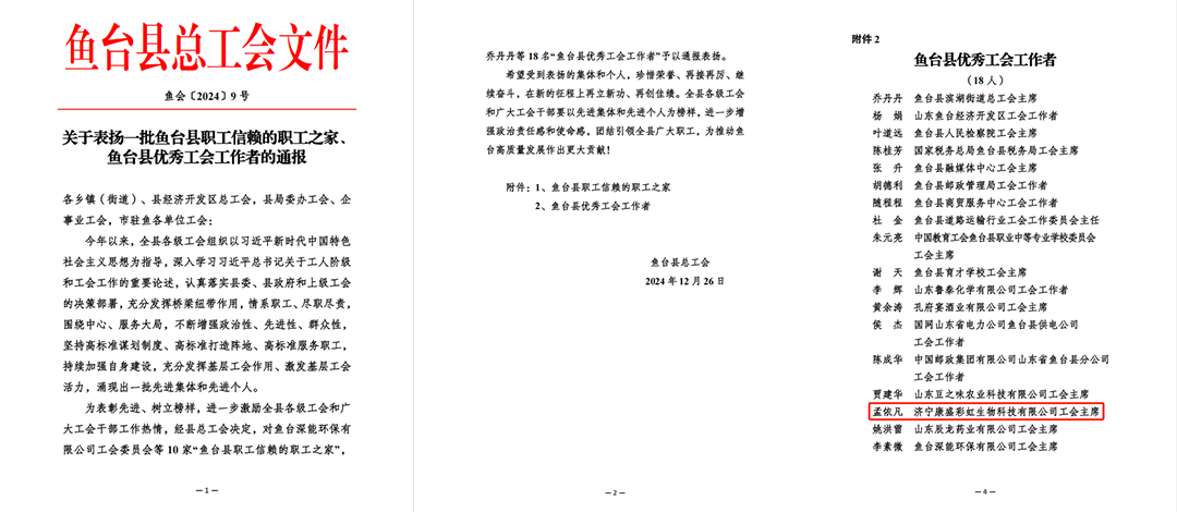 為了表彰先進、樹立榜樣,進一步激發(fā)全縣各級工會和廣大工會干部的工作熱情,魚臺縣總工會近期進行了優(yōu)秀工會工作者的評選活動。在此次評選中,我司常務(wù)副總兼工會主席孟依凡榮獲了“魚臺縣優(yōu)秀工會工作者”的稱號。