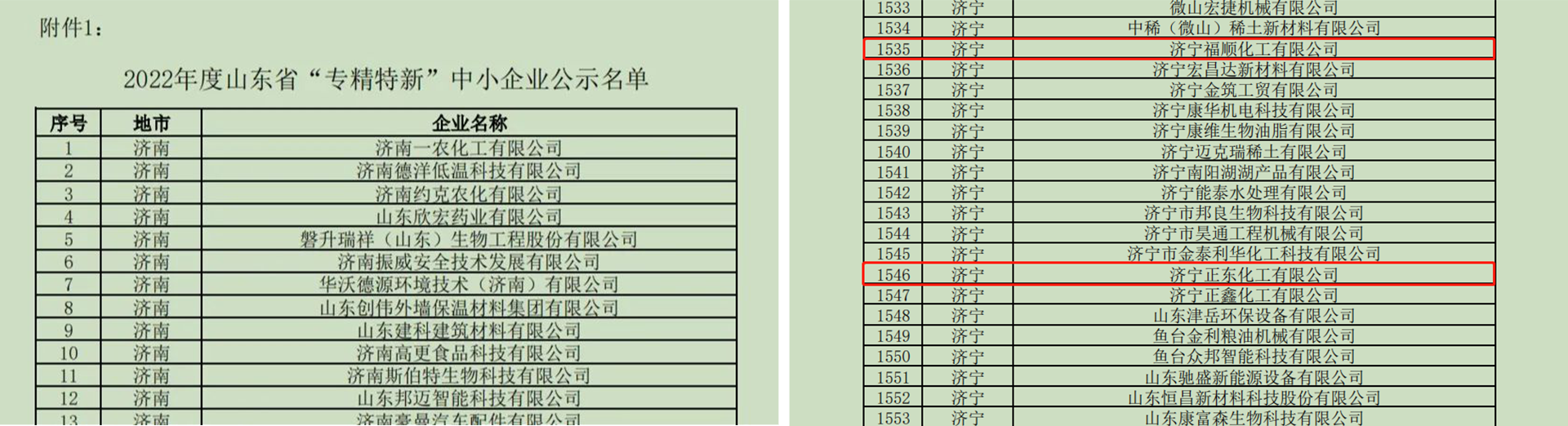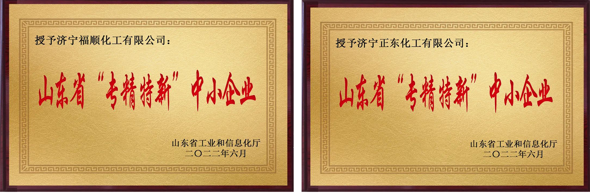 近日,山東省工業(yè)和信息化廳公示了2022年度山東省“專精特新”中小企業(yè)認(rèn)定名單,我司濟(jì)寧福順化工有限公司、濟(jì)寧正東化工有限公司榮獲山東省“專精特新”中小企業(yè)榮譽(yù)稱號(hào)。